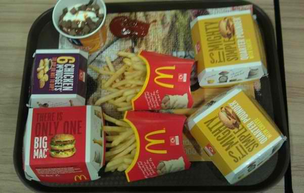 He ordered two Quarter Pounders with cheese, one Big Mac, one six-piece McNuggets, two medium fries, and a Rolo McFlurry. Surprisingly, that’s only about 3,330 calories worth of food . . . it sounds like it should be a lot more.