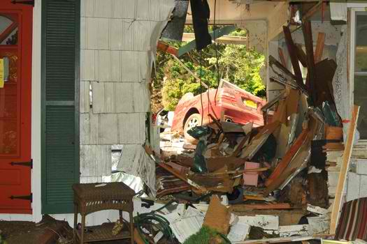 She ended up hopping the curb, SMASHING through the front wall of a HOUSE, plowing through the dining room, plowing through the kitchen, smashing through the back wall, hitting a tree . . . and coming to rest in the backyard.
